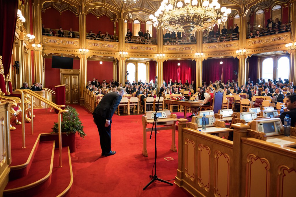 Direktør Kyrre Grimstad bukker for stortingspresident Masud Gharahkhani for å signalisere at H.M. Kongen har forlatt stortingsbygningen. Foto: Peter Mydske/Stortinget
