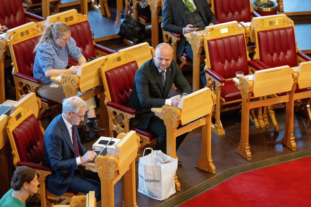 Finansminister Trygve Slagsvold Vedum (Sp) med regjeringens forslag til statsbudsjett. Til venstre statsminister Jonas Gahr Støre (A).