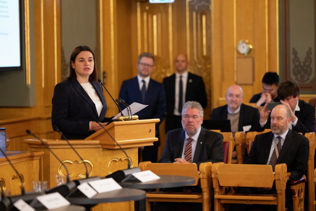 Introduksjon ved Sviatlana Tsikhanouskaja. På første rad i bakgrunnen skimtes Stortingets tredje visepresident Morten Wold og Stortingets direktør Kyrre Grimstad.
