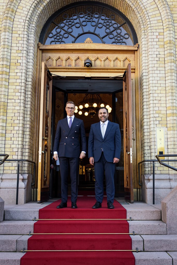 Finlands president Alexander Stubb og stortingspresident Masud Gharahkhani på trappen foran Stortinget.