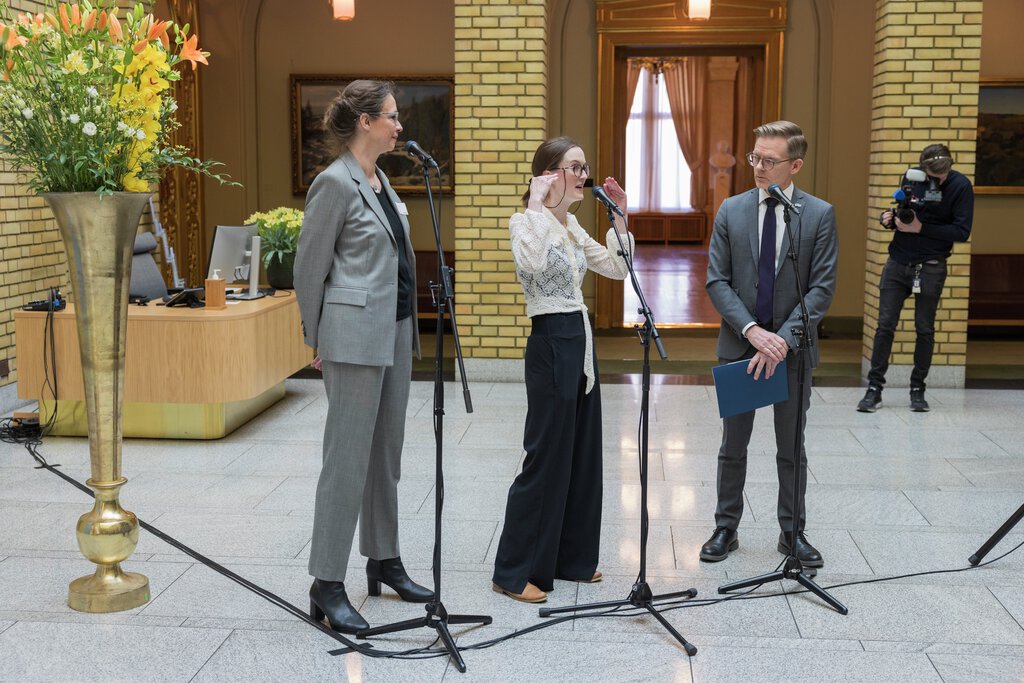 Tage Pettersen i kunstutvalget intervjuer tegner May Linn Clemet og Bianca Boege fra Avistegnernes hus. F.v. Bianca Boege, May Linn Clemet og Tage Pettersen (H).