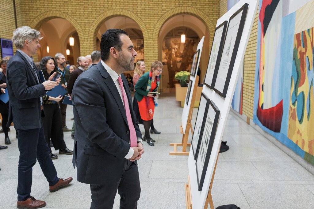 Stortingspresident Masud Gharahkhani ser på de utstilte karikaturene i vandrehallen.