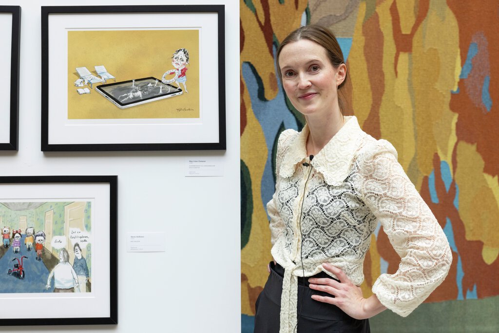 Karikaturtegner May Linn Clement ved sitt verk i vandrehallen.