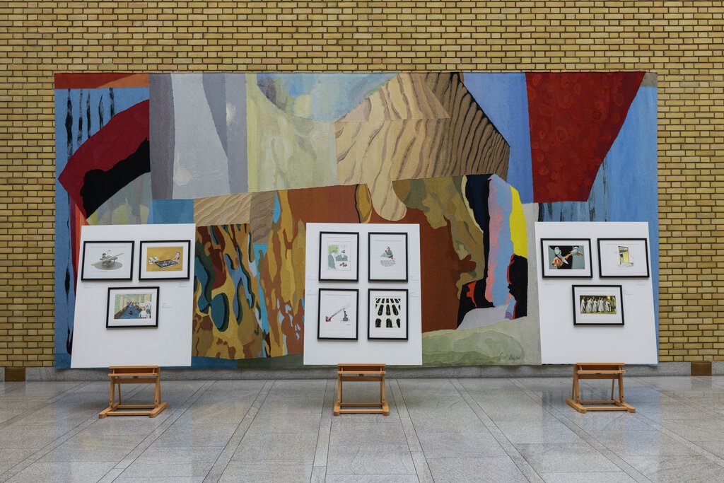 Utstilte karikaturer i vandrehallen.