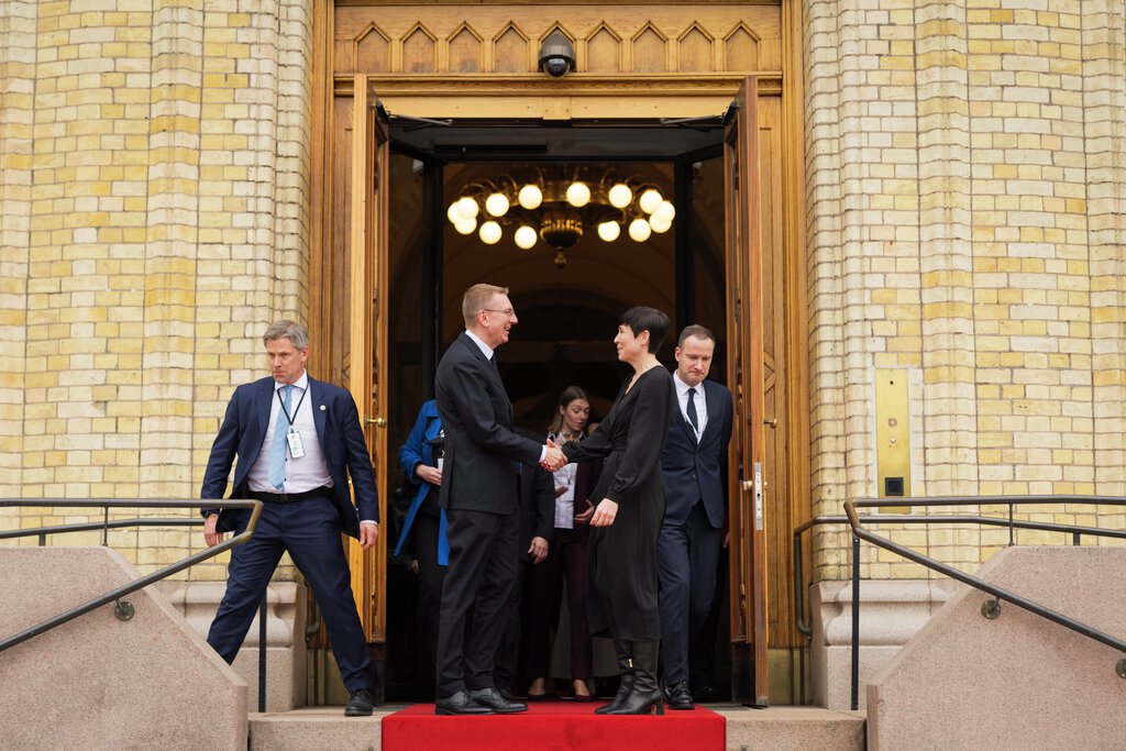 Leder av utenriks- og forsvarskomiteen Ine Eriksen Søreide (H) takker Latvias president Edgars Rinkēvičs for besøket til Stortinget.