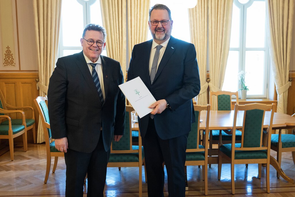Forsvarsombud Roald Linaker overrekker årsmeldingen til første visepresident Svein Harberg.